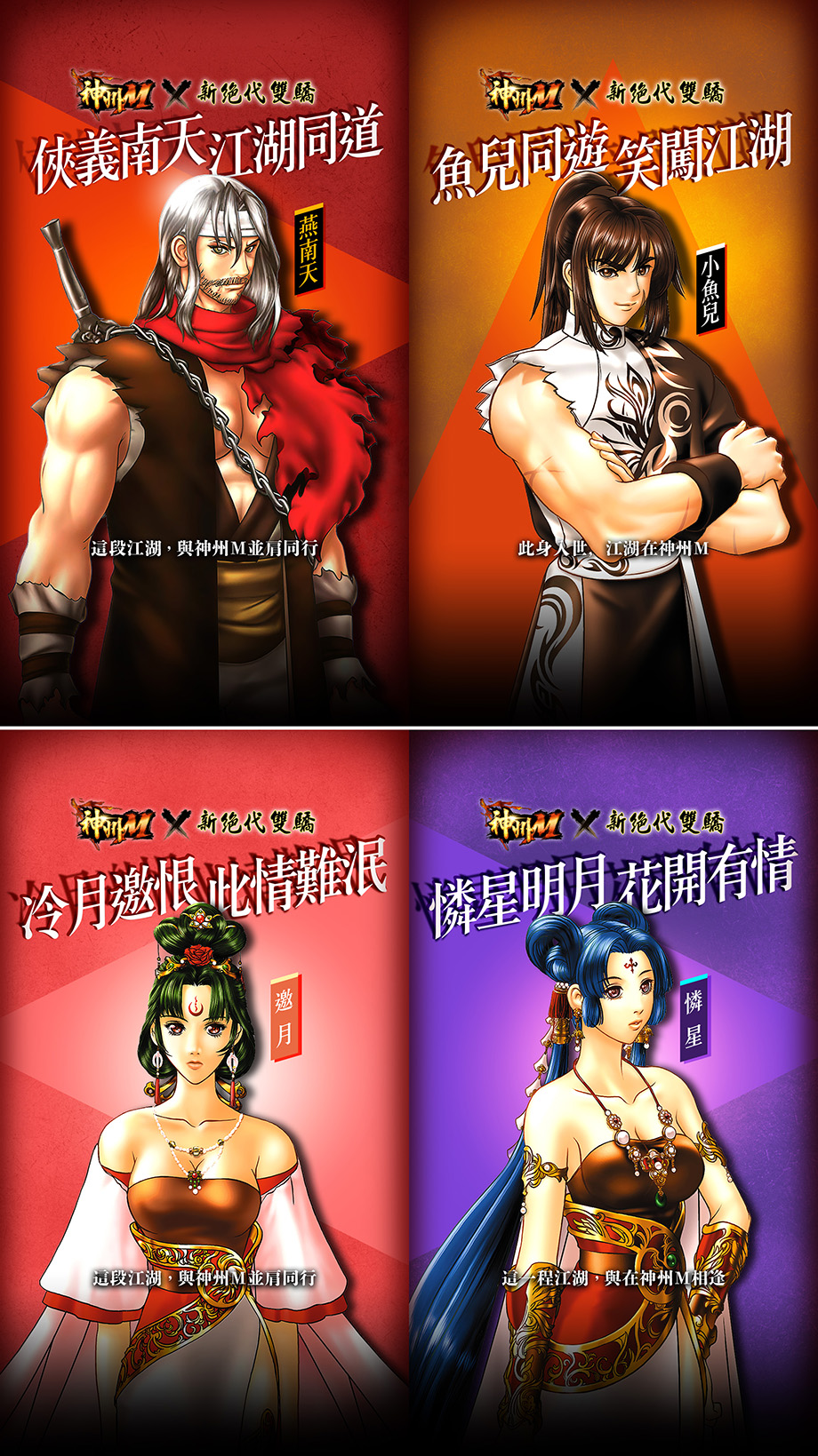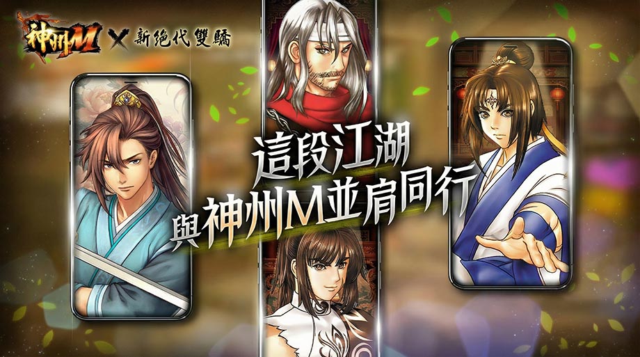 本次聯動採用宇峻奧汀經典單機作品《新絕代雙驕》之原創角色形象,本次聯動第一彈角色正式公開,包含豪氣干雲的「燕南天」、氣質冷豔的「邀月」、溫婉卻深藏鋒芒的「憐星」,以及灑脫不羈的「江小魚」。經典人物設定結合《神州 M》的世界觀與玩法,讓玩家在冒險過程中,親身體驗雙驕的魅力,未來共計八位原著重量級角色將陸續登場,於神州江湖中與玩家相會,重現經典武俠風采。